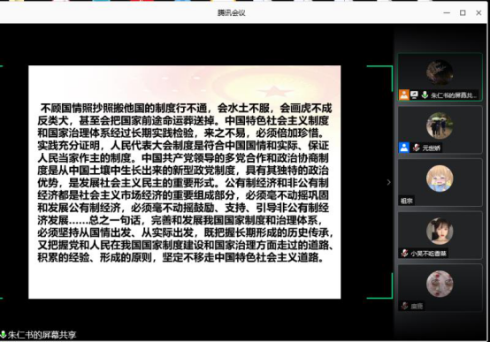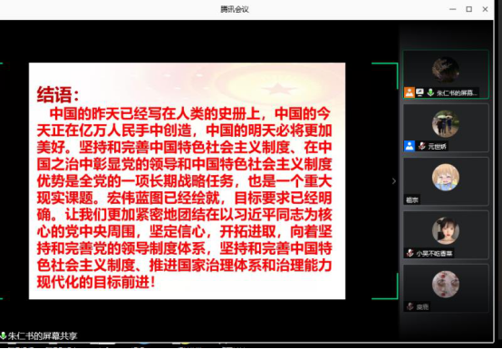 6月22日下午,党总支书记朱仁书以视频形式通过腾讯会议讲授题为“在中国之治中彰显党的领导和社会主义制度优势”党课。经济管理公司党总支全体党员、发展对象及入党积极分子参加。
