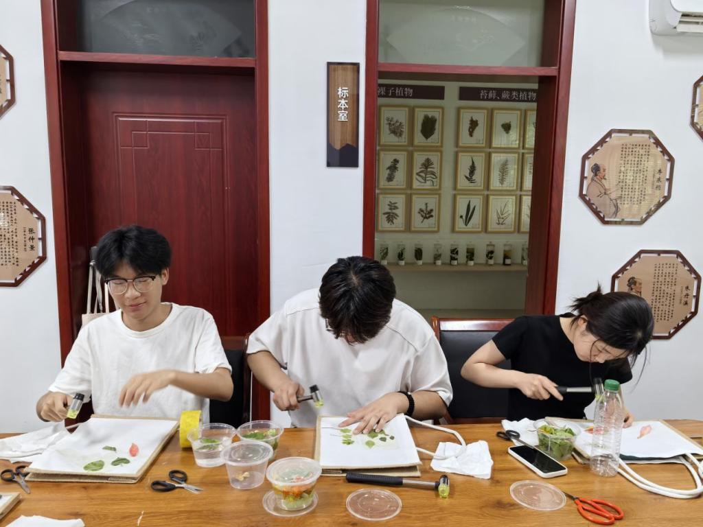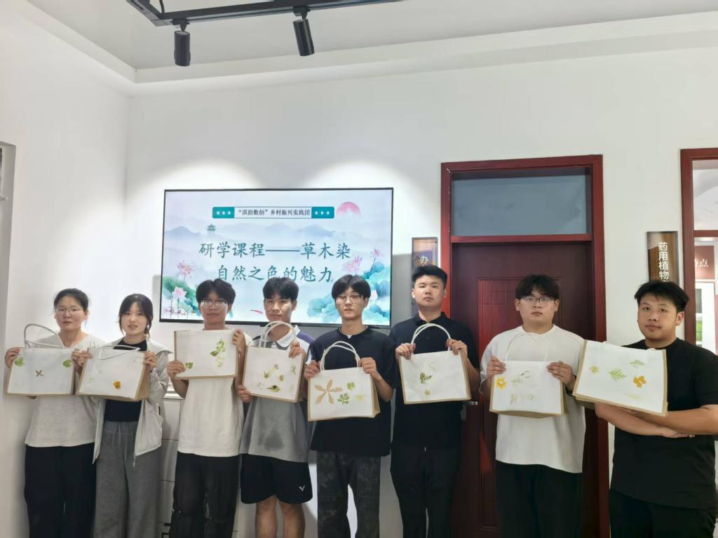 在赋能方面,实践团成功策划组织了“草木染”DIY手工研学活动。参与者们共同采集天然植物原料,亲身体验从花草拓印到染制手提包的全过程,制作出融合地方文化元素与实用价值的文创作品,使传统工艺以可感知、可参与的方式重新焕发生机。