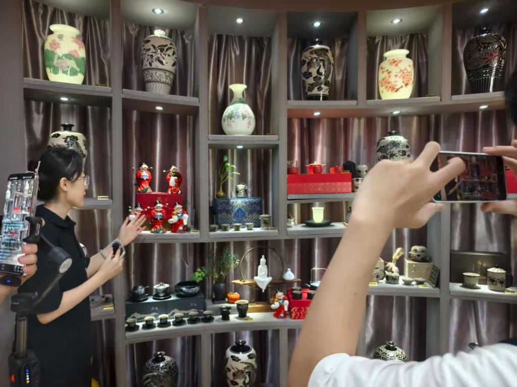 文创类直播分别于鹤壁窑艺术会馆与鹤之品文创馆进行,团队深入介绍非遗历史与工艺技法,展示茶具、摆件等文创产品,通过现场演示与讲解实现非遗带货,助力传统技艺走向大众消费。