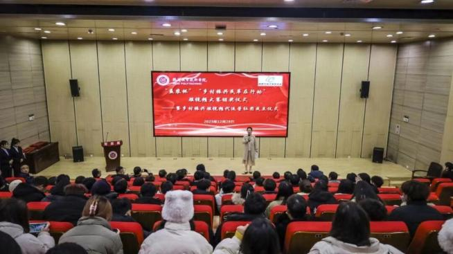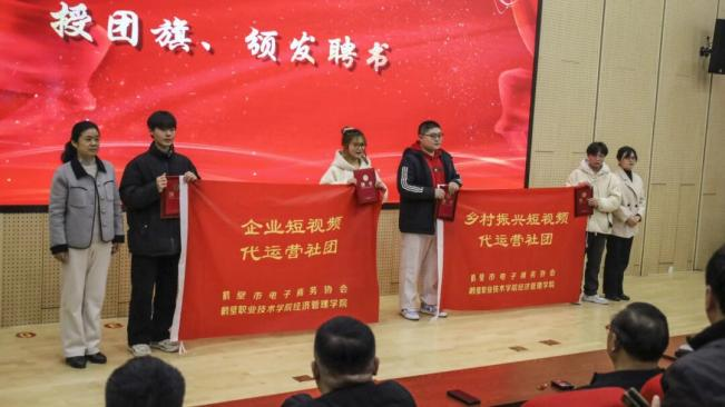 2023年12月28日,经济管理公司联合鹤壁市电商协会在海棠园校区一号报告厅举办“‘益农杯’‘乡村振兴民革在行动’短视频大赛”颁奖仪式暨乡村振兴短视频代运营社团成立仪式。鹤壁市政务大数据中心主任于洪杰、民革鹤壁市委会专职副主委李静、九三学社鹤壁市委专职副主委苏海玲、中百盈科技集团董事长张相生,河南邦太优选食品有限公司副总经理郝文斌,鹤壁窑火实业有限公司董事长张学昆,鹤壁中天电子商务有限公司董事长姬常发,鹤壁云祥职业培训公司董事长王建,河南建木数据科技有限公司董事长贾皓圳、200多名师生参加活动。