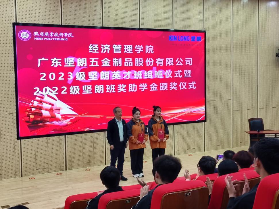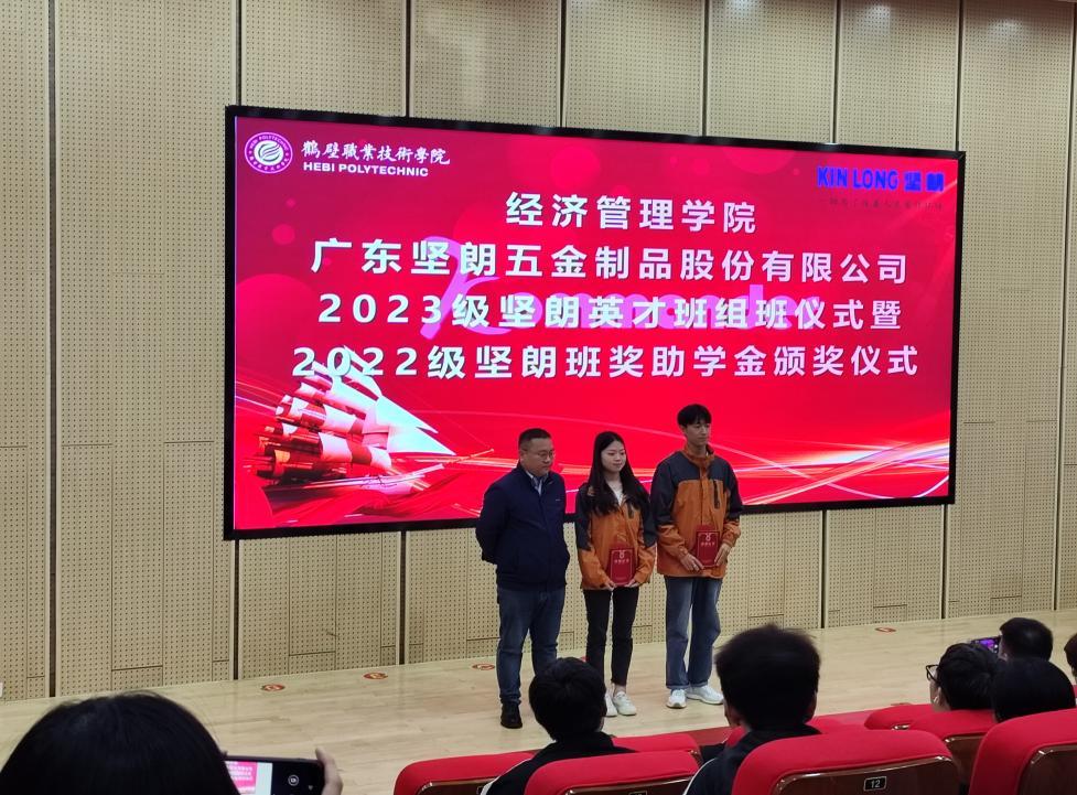 广东坚朗五金制品股份有限公司代表朱吉刚发言,首先回顾了广东坚朗与经管公司两年来的合作经历,并从关于我们、企业布局、合作课程等方面向同学们介绍了公司,表达了对同学们加入坚朗英才班的期许。坚朗华中分公司副总经理朱吉刚、销售代表兼在职员工张宁、经济管理公司副经理白钢华共同为获奖员工颁发证书和奖金。本次获得奖助学金员工7人,发放奖助学金5100元,并邀请获奖代表王京慧同学发言。会议还举行了2023级营销“坚朗英才班”组班仪式。