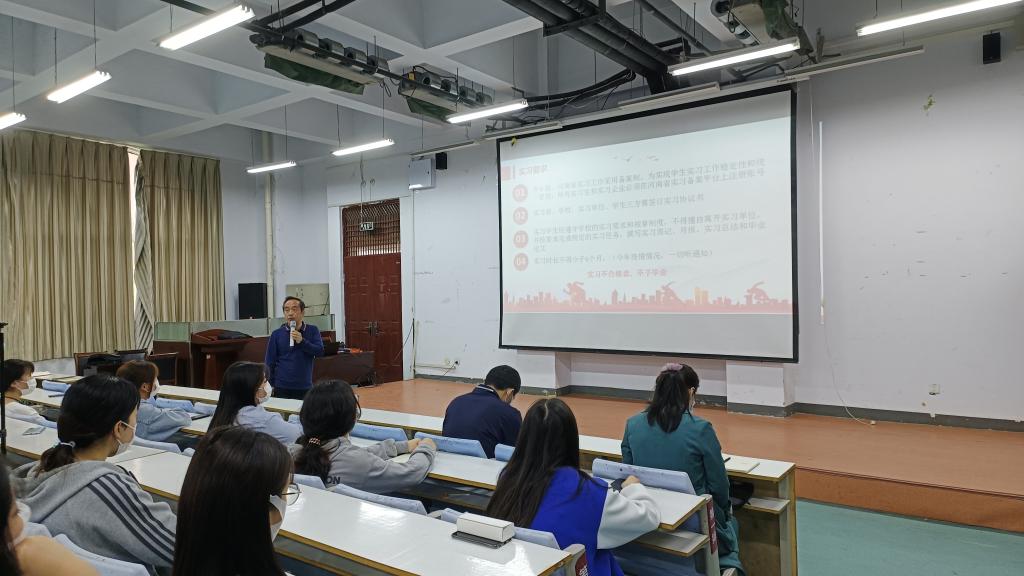 张媛对河南省教育厅有关实习工作的最新政策及法规、实习备案管理规定等情况向同学们进行了讲解并提出要求。