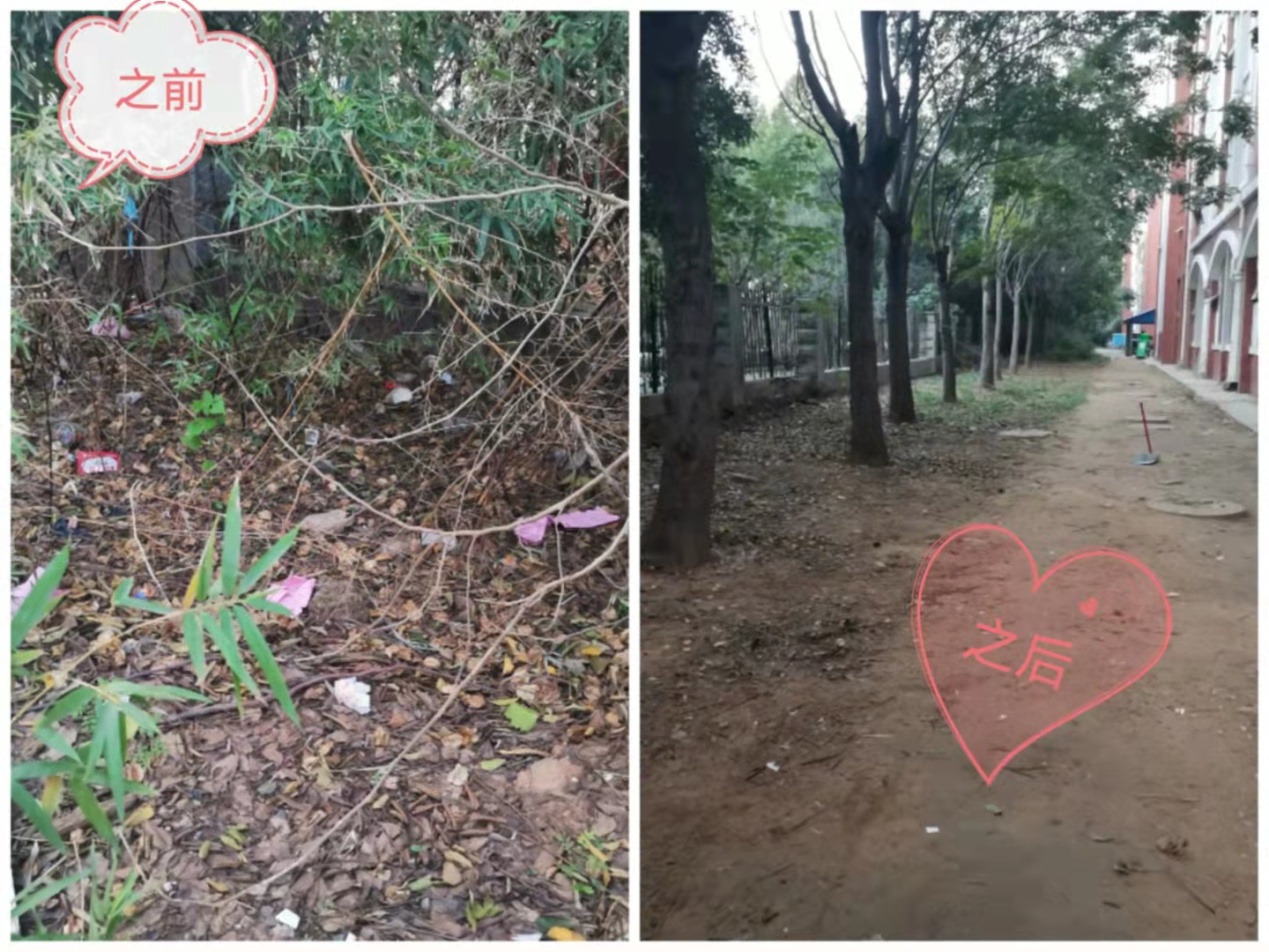 在活动中,每位志愿者都积极发挥奉献精神,不怕脏不怕累,仔细清理绿化带、地砖缝、围墙边等地方的垃圾和堆积物。大家分工合作,有粗有细,彻底清理了多处卫生死角,有效改善了食堂及宿舍周围的环境卫生。同时,经过辛勤地劳动,参与志愿活动的同学们纷纷表示自己以后要做到不随手扔垃圾、不随地吐痰和不高空抛物,为营造干净、整洁、温馨的校园环境贡献一份力量!