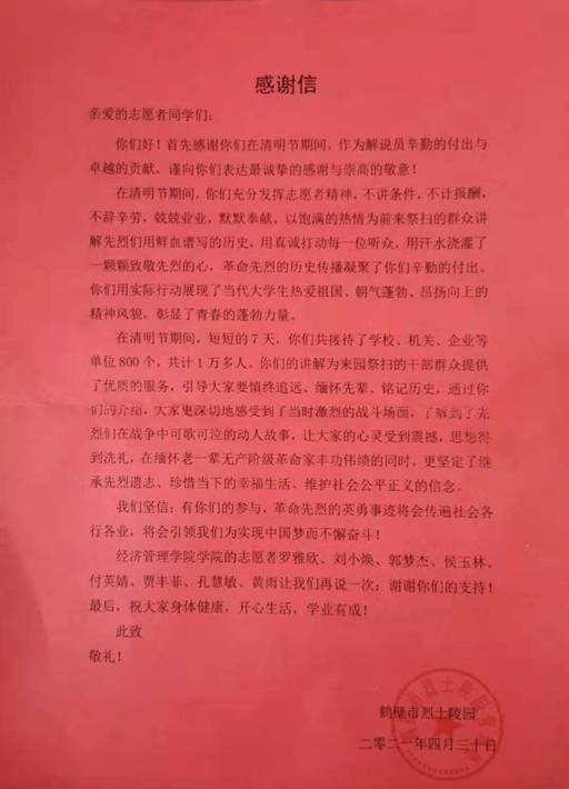 近日,经济管理公司收到鹤壁市烈士陵园送来的感谢信,全文如下: